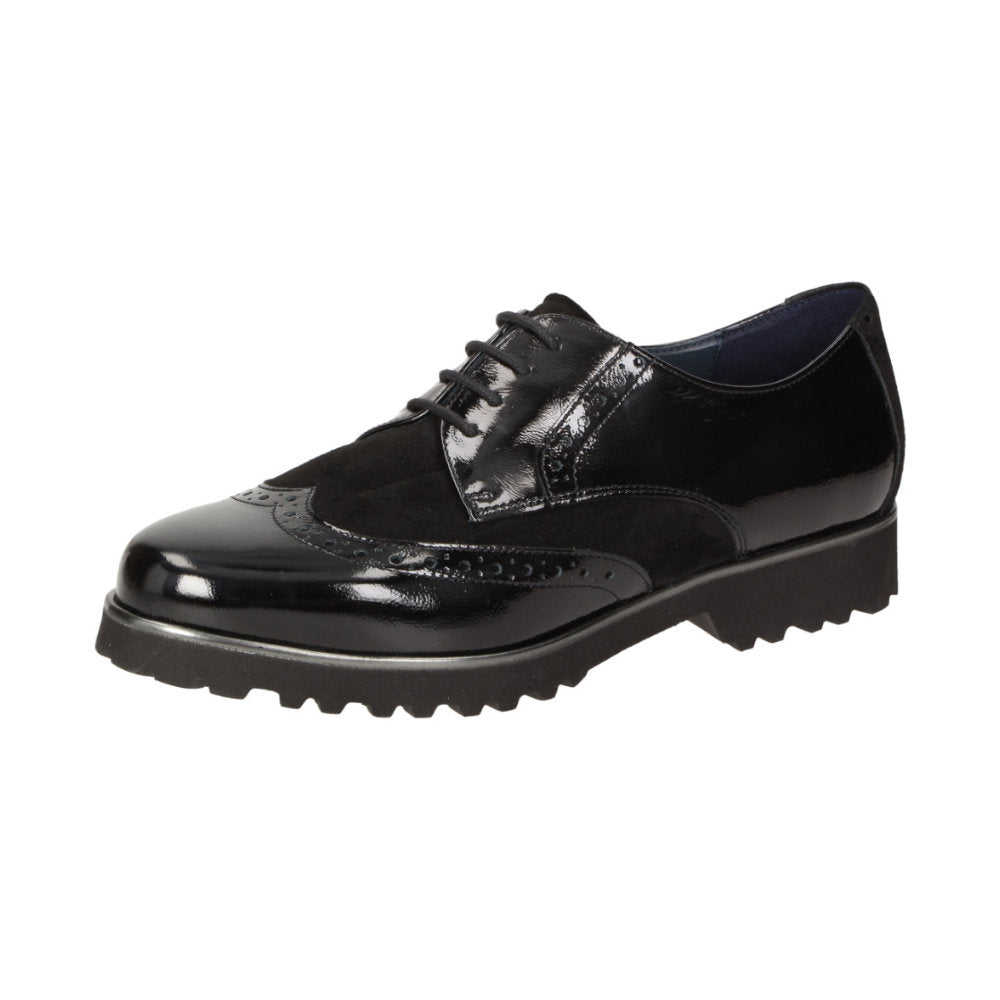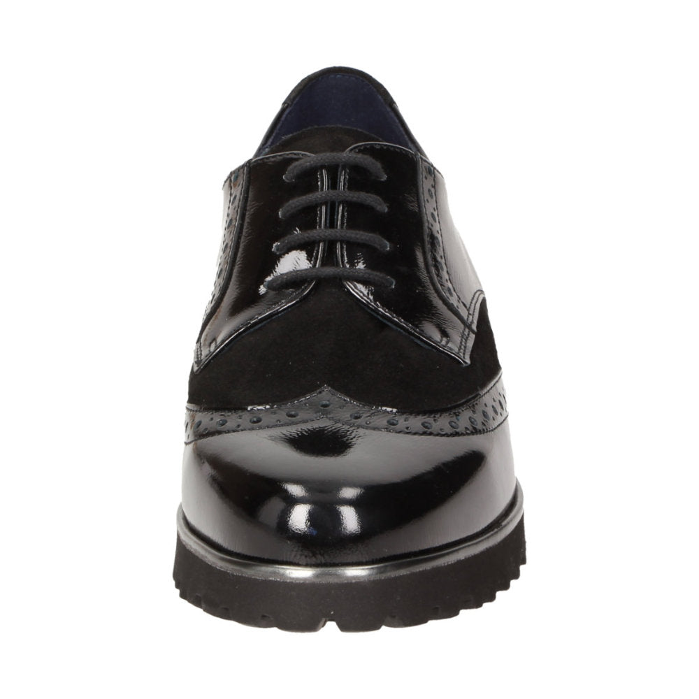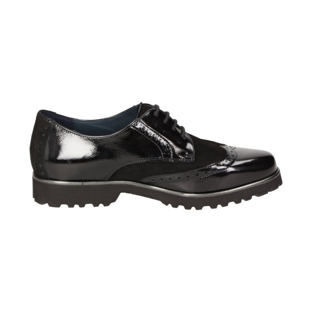 Boyfriend-style women's lace-ups with wingtip in a H-width fitting. Made from a combination of patent leather and suede lambskin, lined with calfskin and a stretchy textile section at the front. Ideal for sufferers of Hallux Valgus (bunions)! Removable, calfskin-covered insole with soft cushioning - can be swapped with your own insole. Lightweight treaded rubber sole with striking leather edging.