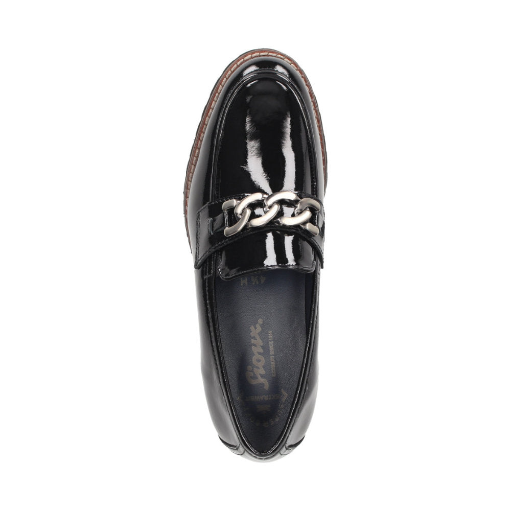 Women's college-look slip-ons in a comfort width (H) with a classic metal-loafer trim and small, elasticated inserts at the tongue - for an enhanced fit. Crafted from crinkled patent leather; it is leather-lined and features a stretch fabric lining in the forefoot. These are bunion-friendly shoes! Removable, leather-covered insole with soft cushioning - can be replaced with a bespoke insole. Cleated lightweight rubber sole in an autumnal look and a striking leather welt.